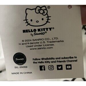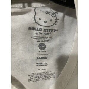 This cute Sanrio Hello Kitty T-shirt features a charming design with 9 Hello Kitty characters on a white background. The shirt has a round neck, short sleeves, and is made of a soft and comfortable blend of 60% cotton and 40% polyester. This women's size L shirt is perfect for fans of Hello Kitty and those who appreciate a fun and playful addition to their wardrobe. Ideal for casual wear, this T-shirt combines a basic style with a touch of whimsical cat-themed charm.