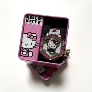 Adorable Hello Kitty-themed LCD digital watch, featuring a pink rhinestone bezel and colorful Hello Kitty artwork on the face and band. Comes in an original Hello Kitty collector tin — perfect for gifting or collecting!