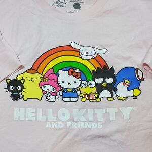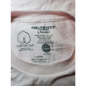 Hello Kitty & Friends by Sanrio womens T-shirt in size Large features a fun pink color with a bold graphic design. Made from soft fabric with short sleeves, this casual tee offers comfort and kawaii style. Perfect for fans, collectors, or everyday wear, it adds playful charm to any outfit.