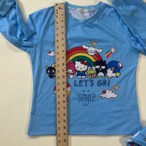 Super cute Hello Kitty pajama set! Features a fun blue and rainbow design with Hello Kitty graphics. Perfect for a cozy night's sleep or lounging around the house. This set is in excellent condition and comes from a smoke-free home. Size 10/12. Don't miss out on this adorable sleepwear!