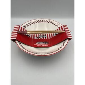 This is a colorful ceramic bowl with chopsticks featuring the beloved character Hello Kitty from the Sanrio franchise. The bowl is decorated with a red bow and multicolor design, making it a perfect addition to any Hello Kitty collection. It is a ramen type bowl which is perfect for food lovers. This item is brand new with tags and was manufactured in 2024 in China. It is a great gift for animation merchandise collectors and Hello Kitty fans alike.