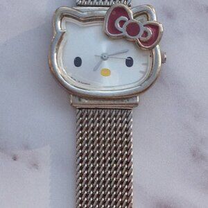 Hello Kitty Sanrio Wrist Watch Big Pink Bow Yellow Nose Silver Mesh Band. So Cute and Classy. Everybody loves a silver Stainless steel Mesh Band, adjustable to fit any adult. Model HK695D. Full normal size face, 1.22", or 31.1mm. Not just illustration of Kitty on a round face, but a full bezel in the image of Ms. Hello Kitty and Bow. Excellent running condition.