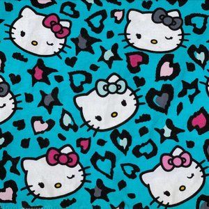 Great condition. Super vibrant. It is a teal blue-green main color. Size tag L Large. Measures 24 inches across the chest and 27 inches overall length. Features: soft cotton blend, v neck, front lower pockets, straight back. Such a fun Hello Kitty cheetah print! Please see all gallery photos. We are a smoke free, pet friendly home. Have a great day!