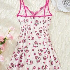 Charming Hello Kitty chemise with pink lace accents. Soft fabric for a restful sleep.
