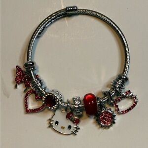 This delightful Hello Kitty bracelet features a silver and red color scheme, highlighted by a prominent red glass bead and charming Hello Kitty motifs. The bracelet is adorned with silver-toned charms and red crystal clusters, creating a festive and playful look. Perfect for adding a touch of whimsy to any ensemble.