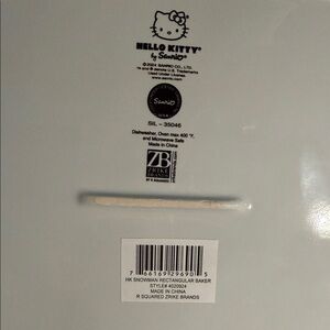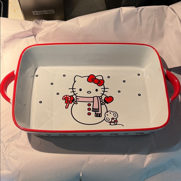Adorable Hello Kitty baker with snowman motif. Perfect for festive occasions.