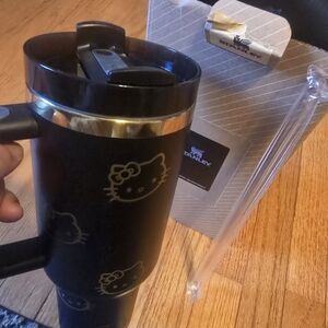 Featuring an all-over Hello Kitty design on a sleek matte black finish, this tumbler is both stylish and functional. It includes a comfortable handle and insulated interior to keep drinks hot or cold for hours.