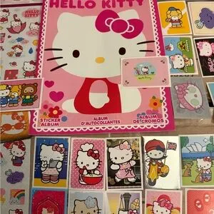 Hello kitty sticker album and sticker lot. All trading card sized stickers are for in the sticker album. Some stickers already in the album. Comes with hello kitty pez dispenser.