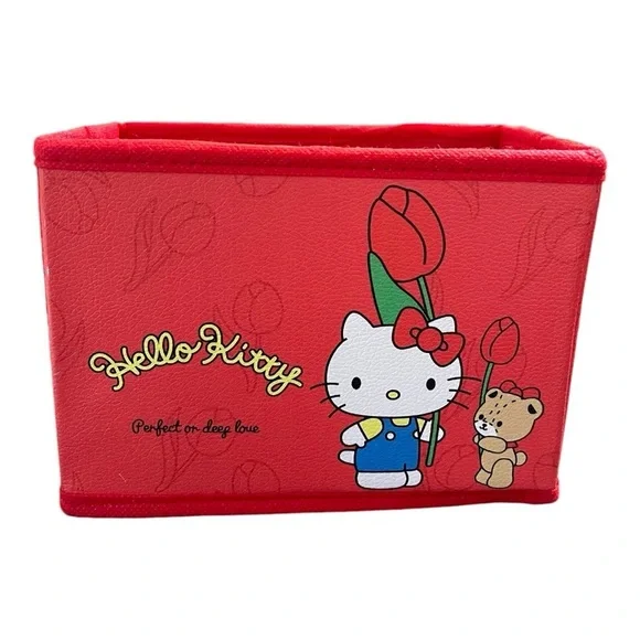This adorable Hello Kitty storage box is perfect for organizing small items while adding a pop of color to any space! With a cute design featuring Hello Kitty and her teddy bear holding tulips, this red box brings a touch of charm to any room.