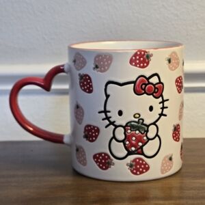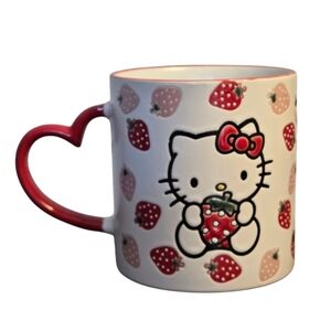 Adorable Hello Kitty Strawberry Love mug by Blue Sky Clayworks in collaboration with Sanrio! This charming ceramic mug features Hello Kitty surrounded by strawberries, a heart-shaped handle, and vibrant hand-painted details.