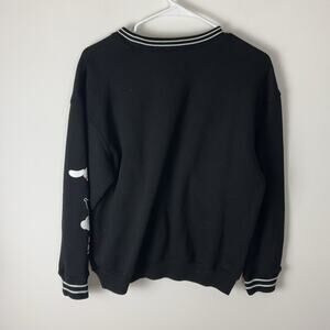 Gently Used Hello Kitty Crewneck Sweater. This is a women's medium. Mostly black with multicolor Hello Kitty designs. White stripe accents on the neck and wrists. Fun sweater! 65% polyester, 35% rayon.