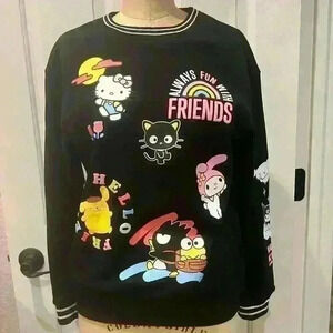 Hello Kitty Always Fun With Friends Crewneck Sweatshirt. Striped rib trim around neck and sleeve cuffs.