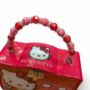 2012 Hello Kitty tin lunch box by Tin Box Co. for Sanrio featuring adorable pink and red graphics with Hello Kitty and duck design. This charming piece includes a beaded handle in coordinating pink and red tones.