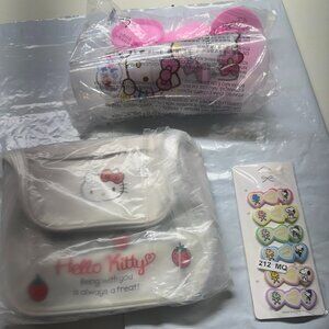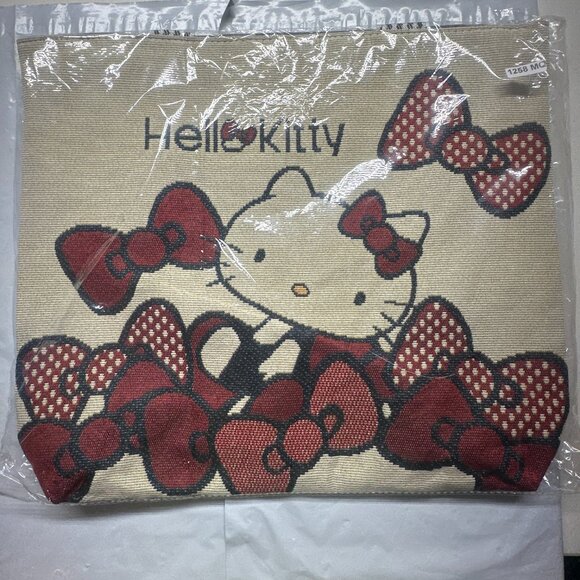 Tote bag is 17 wide by 14 5/8 tall. Yes it has handles inside the bag. also a pocket. your also getting 3 drinking cups with lids. 2 hair barrettes. and a hello kitty bag. Did not open for picture.