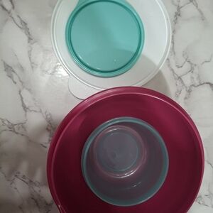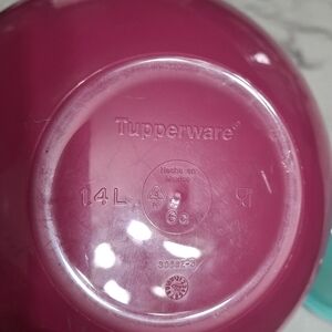 Vibrant pink hello kitty Tupperware bowl and aqua blue Tupperware bowl. Ideal for kitchen use. Both new.