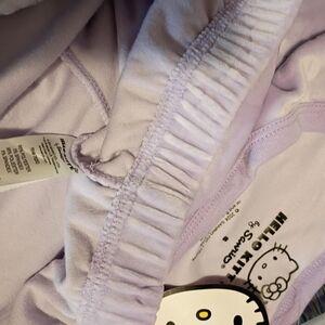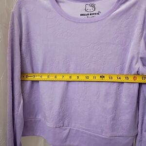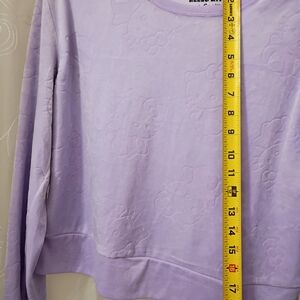 Charming Pastel Purple Set with Hello Kitty Logo all over. Includes sweater and Pants.Size Small,but fits more like a Medium-See Measurements for reference.So Soft and Cozy...