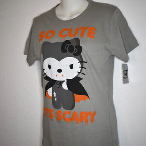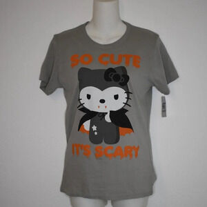 New with tags. Rare Doe Hello Kitty Graphic Tee T-Shirt 'So Cute It's Scary' by Sanrio. Gray with orange graphics. Crew neckline. Short sleeves. Purchased at Hot Topic back in early 2000s. Size per tag M (Medium). Fabric: 100% Cotton. Brand: Doe. Made in USA. Size per tag does not guarantee desired fit, please see pictures for measurements.