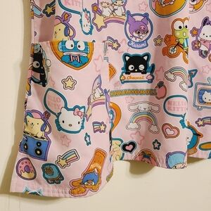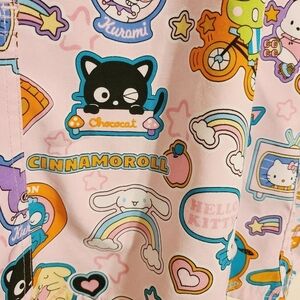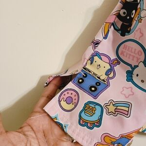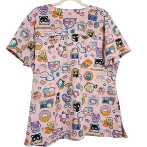 Adorable scrub top with a fun cartoon print by Hello Kitty, size 2XL. Features cute Hello Kitty and Friends characters in vibrant colors. Perfect for adding a playful touch to your work attire. V-neck, two front pockets and small side splits. Fabric blend of polyester and spandex. Excellent pre-owned condition; no flaws.