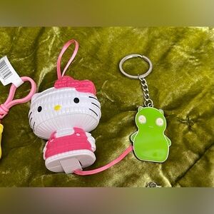 Charming Hello Kitty keychain set with colorful characters. Includes pink Hello Kitty, green frog, and black-haired figure. Fun for backpacks or accessories.