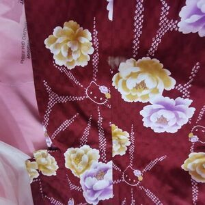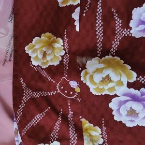The listing is for the pre-owned clean 2006 Hello Kitty floral adult size yukata with a pattern that features small hello kitty heads wearing flowers and brown textured fabric. There is a white stain in the front middle shown in the second photo. No size indicated, it is 64 inches in length from the back of the neck to the bottom of the yukata. Mannequin measurements: Bust : 35" , Waist : 26.5" , Hip : 36" . No obi included.