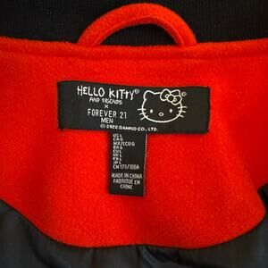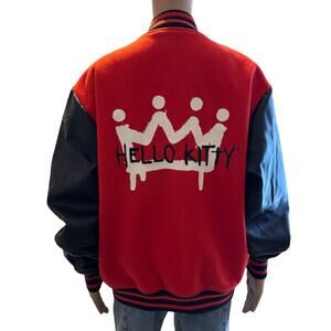 this woven varsity jacket features striped trim, "Hello Kitty" chest embroidery and back text, back crown graphic, faux leather long sleeves, snap-button front closures, and slant front pockets.