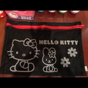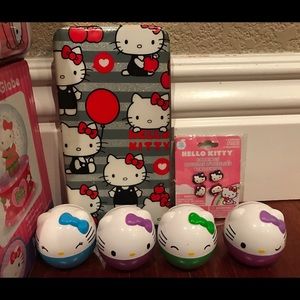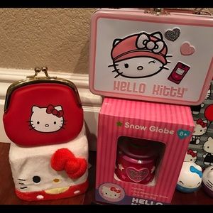 A bundle of hello kitty items. Hello kitty box plush, hello kitty snow globe, hello kitty coin purse, hello kitty lunch box, hello kitty wallet, hello kitty coin balls, hello kitty earrings, and hello kitty bag