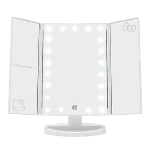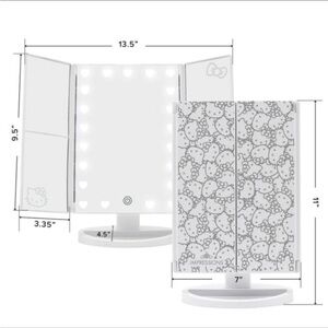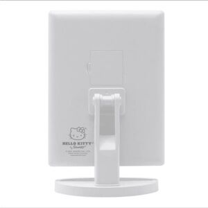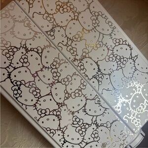 White accessory with repeated Hello Kitty metallic motif. Shiny silver and gold foil detailing across surface. Cute, collectible Sanrio-inspired design. Sleek and playful look.