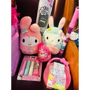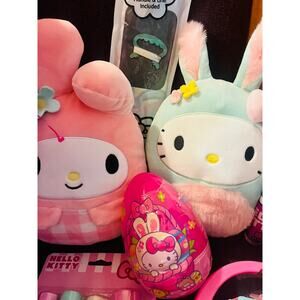 Hello Kitty storage bin Easter bundle 60 x 90 strawberry soft throw with hello Kitty and my melody squishmallows ,hello kitty and friends 200 jewelry accessories and case Hello Kitty chalk, bubbles , kite, large Easter egg and sweet shop built set .All items are new and comes with a hanger will provide clear plastic gift bag. Can add to the bundle. Items are ready to ship. Thank you.