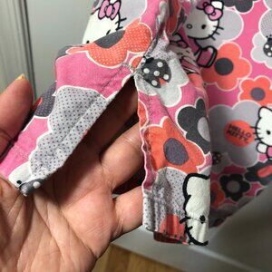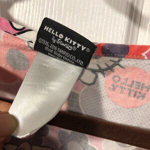 Hello Kitty women pink and orange scrub top, size XL, V neck, short sleeves, measures approximately when laying flat: shoulder edge to shoulder edge 18", armpit to armpit 25", length at back 27"