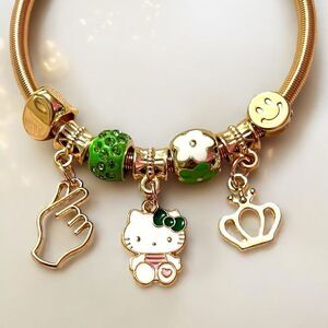 Hello Kitty Green Smiley Face Crown Love Sign Gold Tone Stretch Charm Bracelet