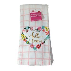 Hello Love Kitchen Towels Floral Heart Wreath Pink Cotton 2-Pc Holiday Gift NEW