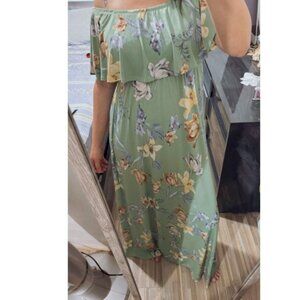 Hello Miz maternity maxi dress in size L. Soft, stretchy fabric with floral print and off-shoulder ruffle detail.