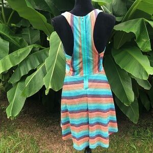 Blue Striped Fit & Flare Racerback Dress by Hello Miss. Round Neckline. Shoulders Are Cut In For Flattering Look. Zips Up the Back. Aqua Blue, Orange & Purple Stripes. 100% Polyester