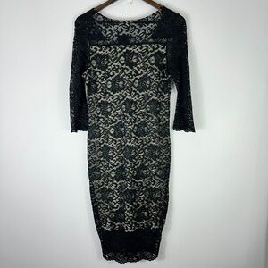 Hello Miz women's size Large maternity-friendly lace dress featuring a black floral lace overlay on a nude lining. Stretch bodycon fit with 3/4 sleeves and a scoop neckline. Elegant yet bold, this fitted dress works well for maternity photoshoots, date nights, or formal events with a romantic or dark feminine aesthetic. Made in the USA.