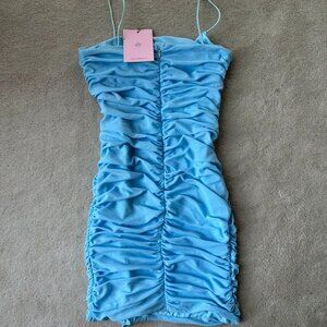 Brand new with tags and never worn! This gorgeous Hello Molly mini dress features flattering ruched sides, an asymmetrical figure, and flirty ruffle detailing. The vibrant blue color makes it perfect for parties, weddings, or a night out.