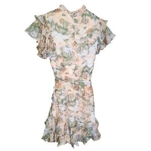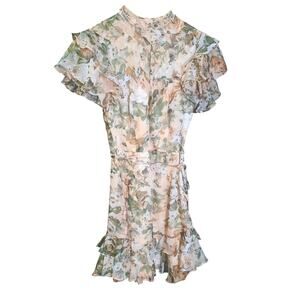 Chic floral mini dress. Features ruffled sleeves and hem. Perfect for a stylish outing.