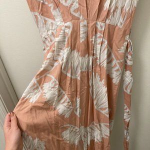 Light cotton material, deep V Neck, pleated top shoulders and waist, removable belt that ties at waist, hidden back zipper, small front slit around knee / shin