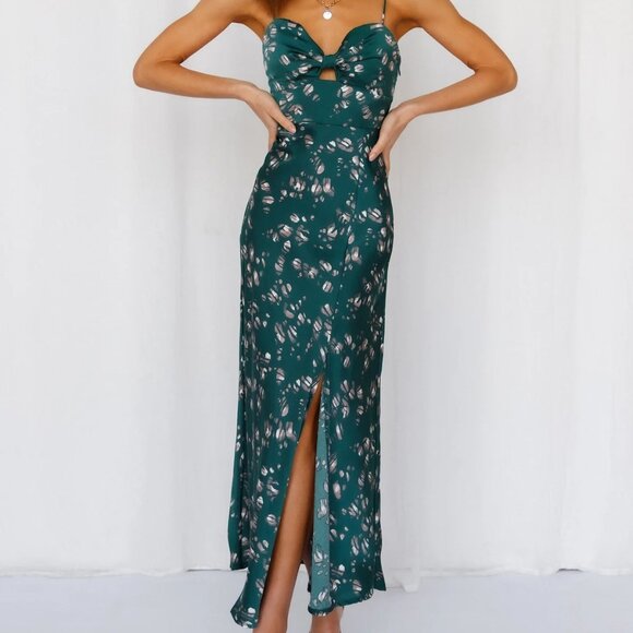 Elegant green midi dress with floral pattern. Features a sweetheart neckline and front slit. Perfect for any occasion.