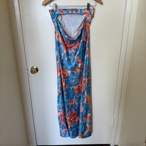 - Maxi dress featuring floral print, satin fabric, strapless design, and back cutout.