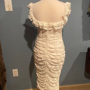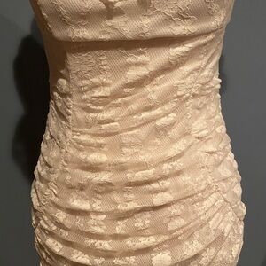 Stylish ivory lined dress with elegant design. Ideal for any formal event. Can be worn on or off shoulder