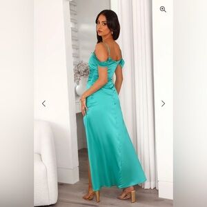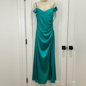 Hello Molly Luxury Affair Satin Maxi Dress Off The Shoulder Ruched Green 8 NWT