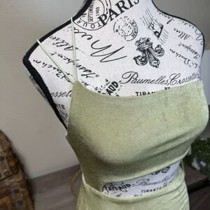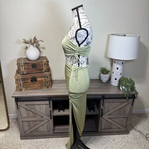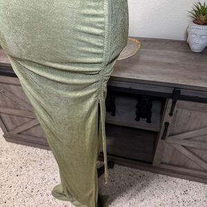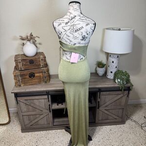 Hello Molly One Shoulder Cut Out Maxi Dress Sage Green Shimmery Sz 4 Ruched Slit