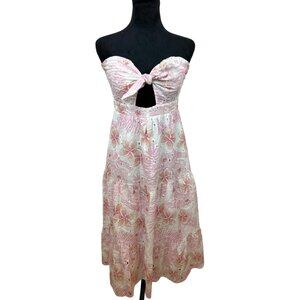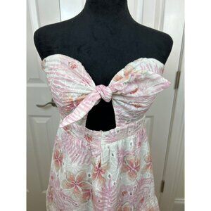 This stunning sundress by Hello Molly features a strapless, bustier design with a sweetheart neckline and a chic cut-out detail. The pink and white color palette is perfect for a wedding guest or resort wear, offering a light and airy feel with its flowing A-line silhouette. The dress combines elegance and femininity, making it an ideal choice for warm-weather occasions.