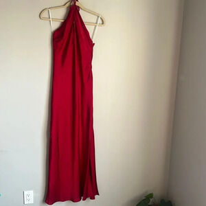 Elegant red maxi dress. Halter neckline. Side slit detail. Perfect for evening wear.