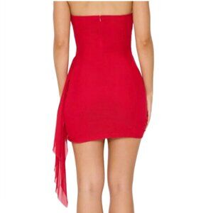 Stunning red mini dress. Strapless design. Asymmetrical hem. Perfect for a night out.