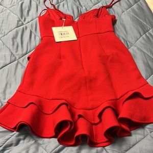Chic red mini dress. Features ruffle details. Spaghetti straps. Perfect for a night out.