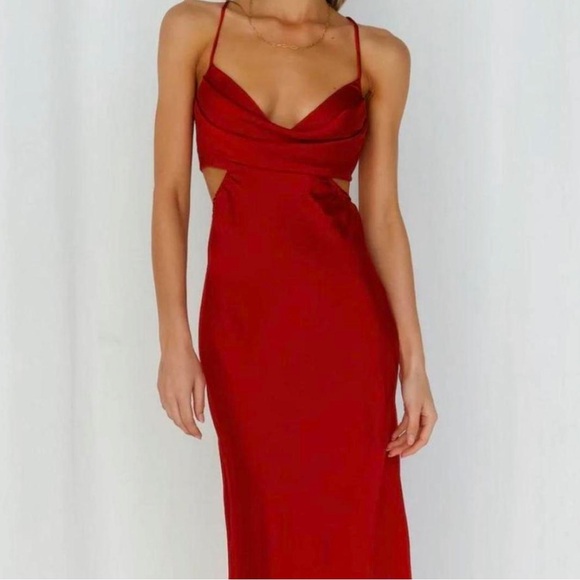 This stunning Hello Molly gown features a vibrant red hue and a strapless neckline, perfect for making a statement at weddings or cocktail events. The sleeveless design and sleek silhouette create an elegant and sophisticated look. Crafted with a minimalist style, this dress emphasizes its streamlined shape and solid coloring, ensuring you stand out in any crowd.