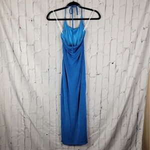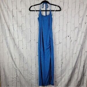 Hello Molly blue no bad vibes tie halter ruched side slit woven midi dress