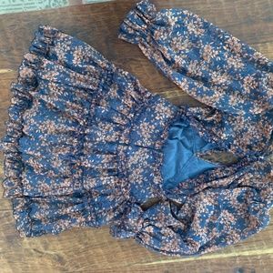 Navy blue and muted pink floral dress. Long sleeve with ruffle detailing. Zip in the back, then 3 buttons on the top to secure. Worn once, perfect condition!