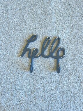 Black decorative 'hello' wall hook. Adds a welcoming accent and practical hanging hooks. Durable metal design with a distressed finish perfect to hang keys or dog leashes